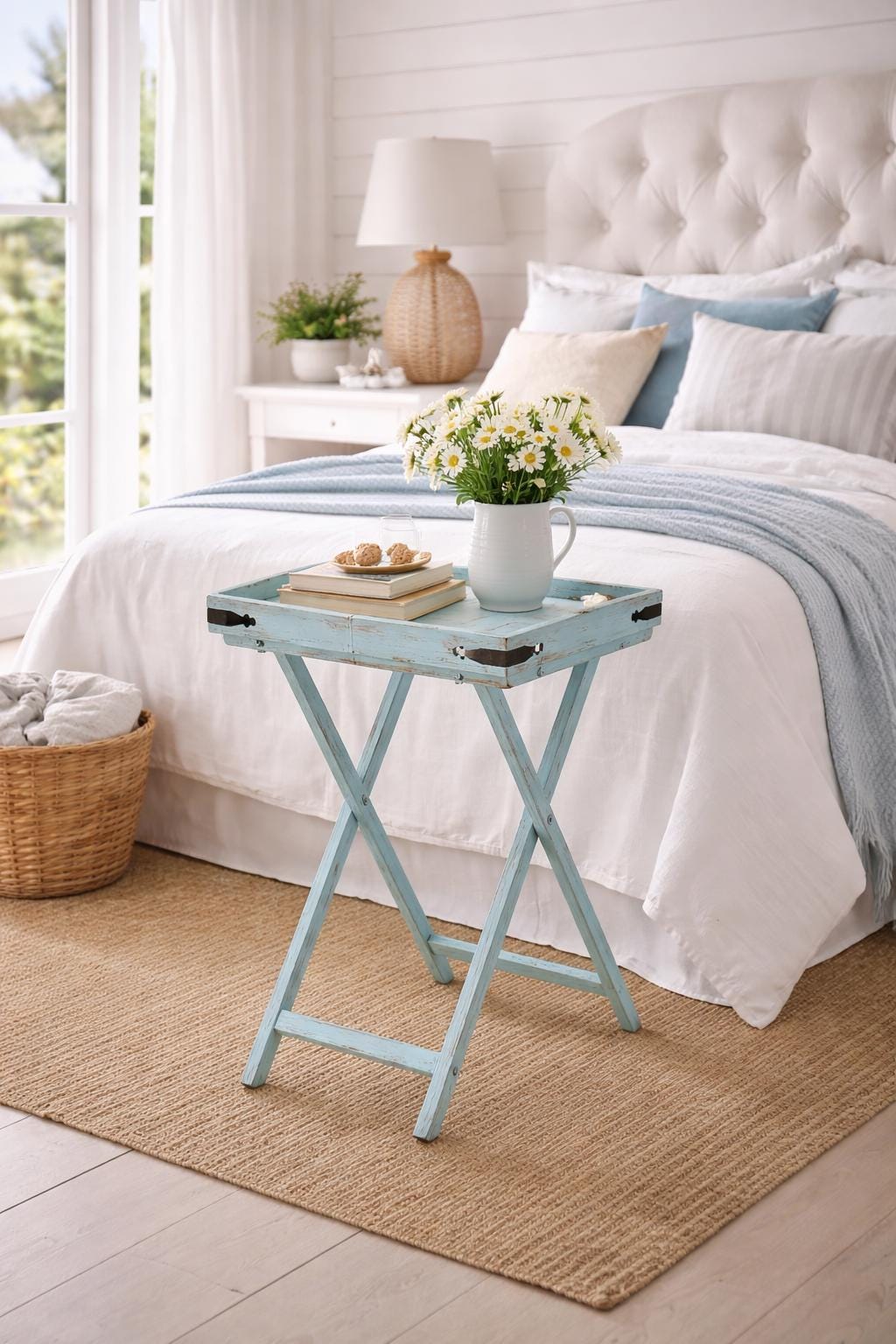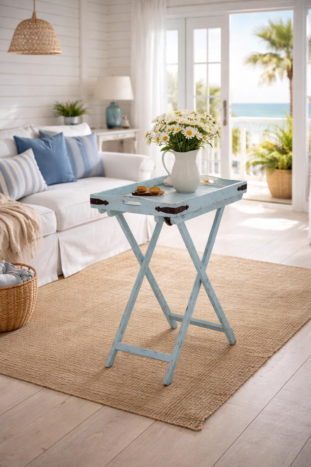 A unique wooden table, crafted from recycled wood with a beautiful natural blue patina for a bright, summery feel – a distinctive piece with the charm and character of aged wood, showcasing its originality and soul. It can be used as a serving table, garden table, side table, or coffee table. You alone decide how to use this one-of-a-kind piece; it is simply stunning and a real eye-catcher in any room – it certainly creates a striking contrast and invites you to linger – a piece of furniture to fall in love with.