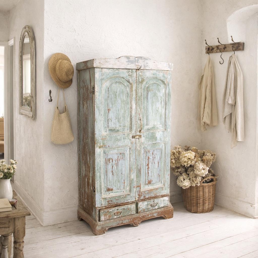 This chest of drawers presents the old, rustic feeling of home, not perfect but unique and dreamy in its vintage appeal - soft blue, old fittings and worn patina - small details with a big impact, if you are looking for something special this is exactly the right thing.