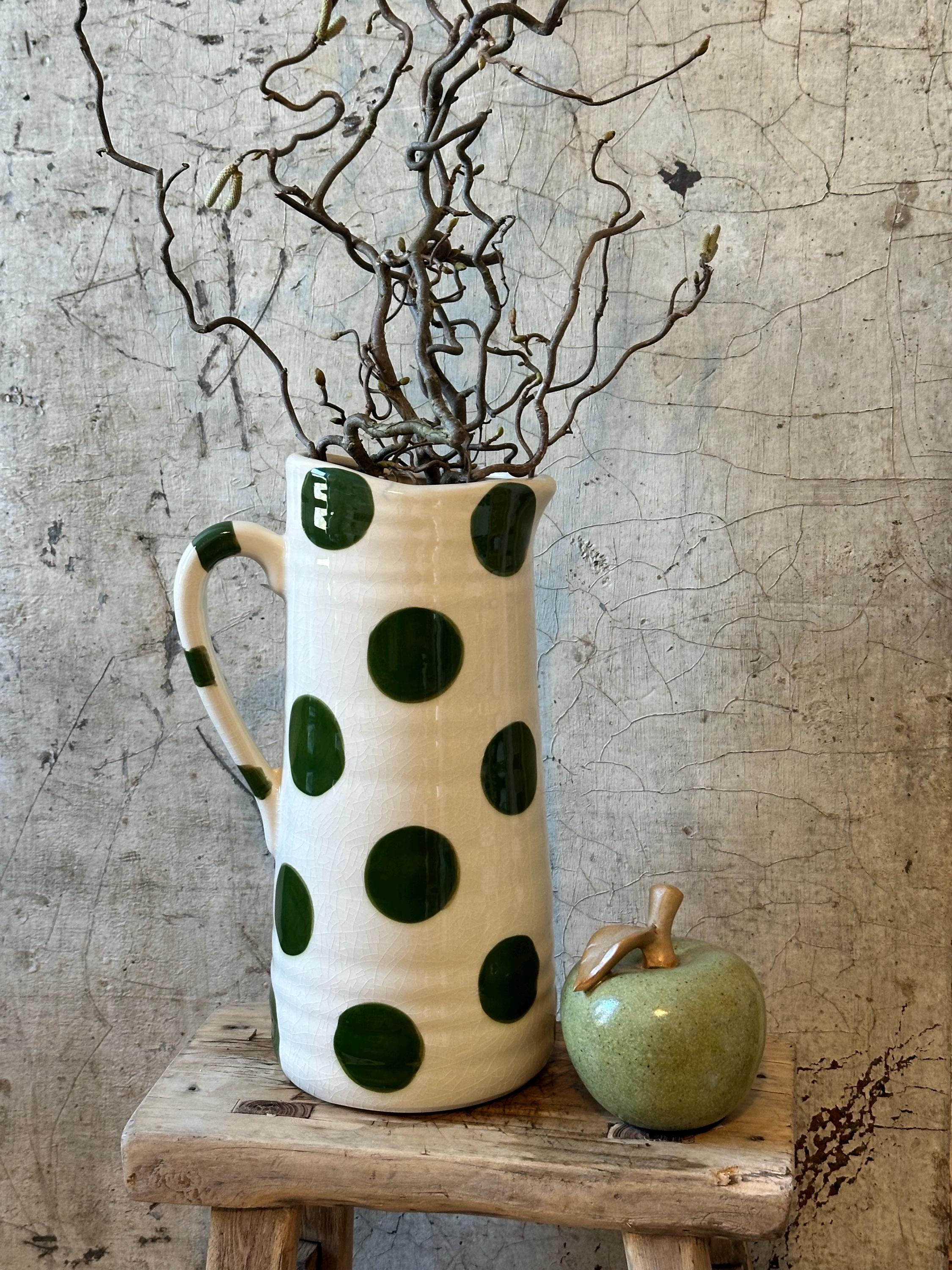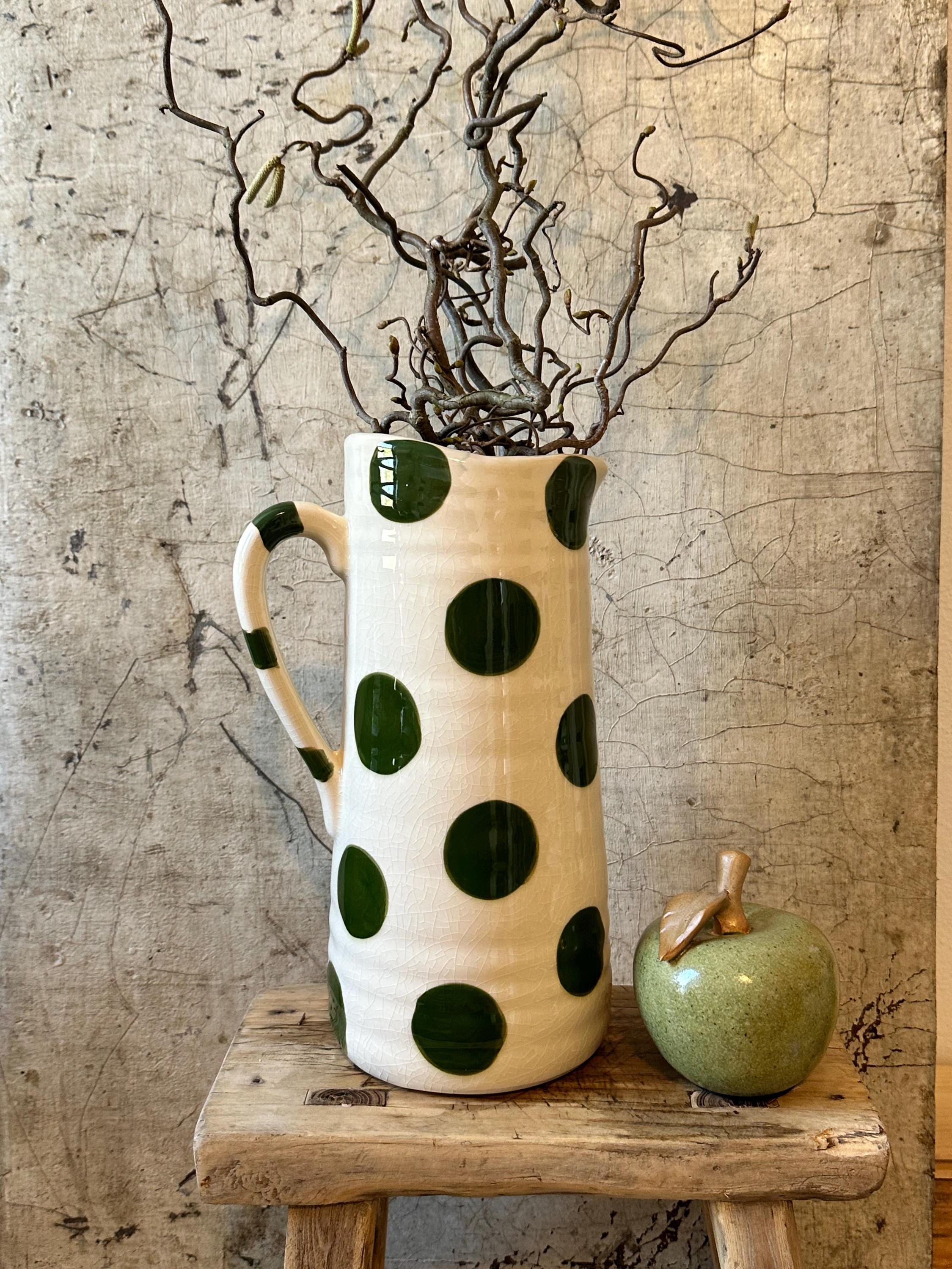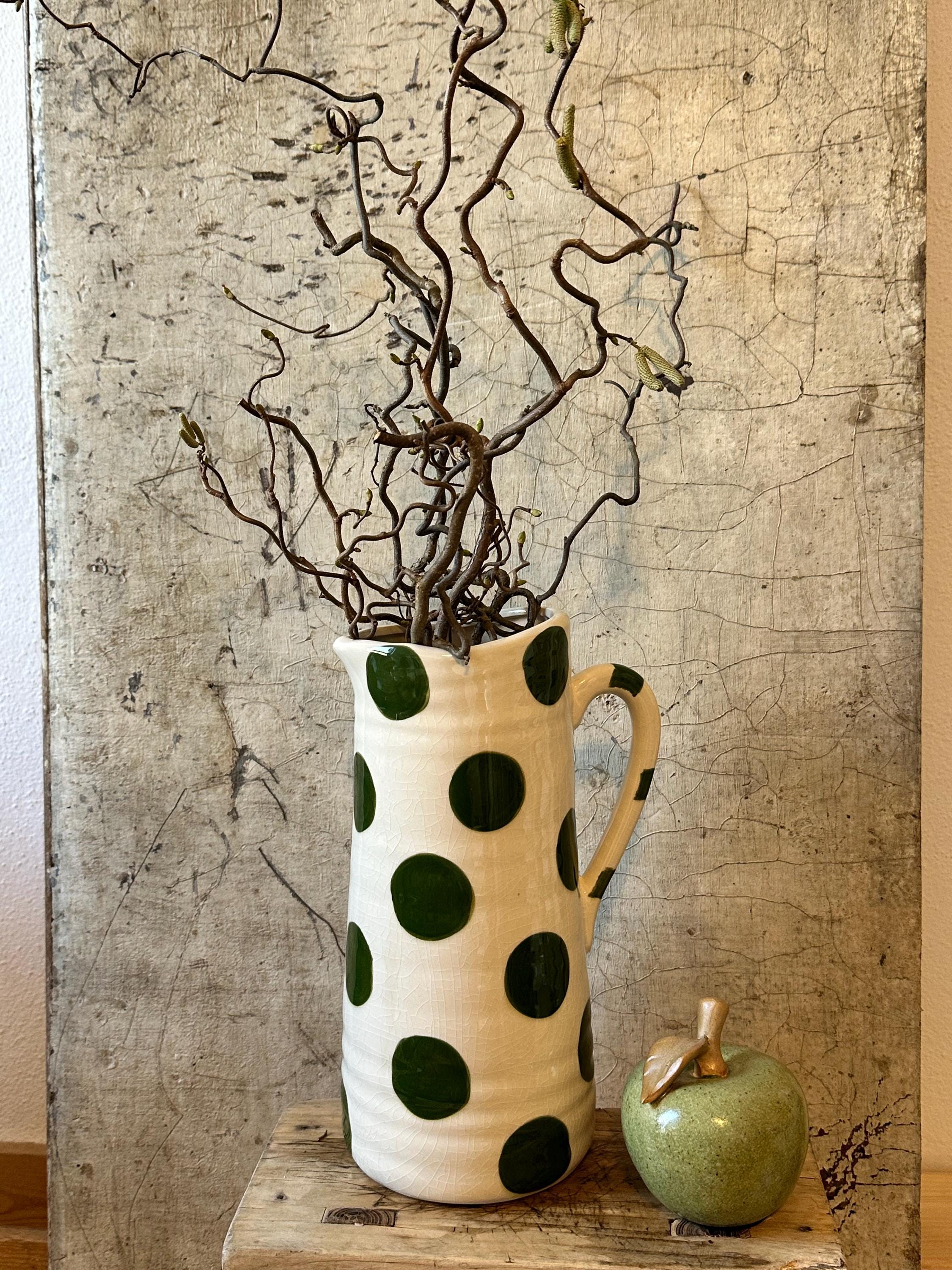 A cheeky ceramic jug - this enchanting jug is modeled after the Swedish country house look - a charmingly cheeky pattern with green dots combined with this beautiful old cracked patina, as if the jug were decades old - it evokes memories of bygone times and is a lovely companion for fresh meadow bouquets, branches or dried grasses - create your own ambience.