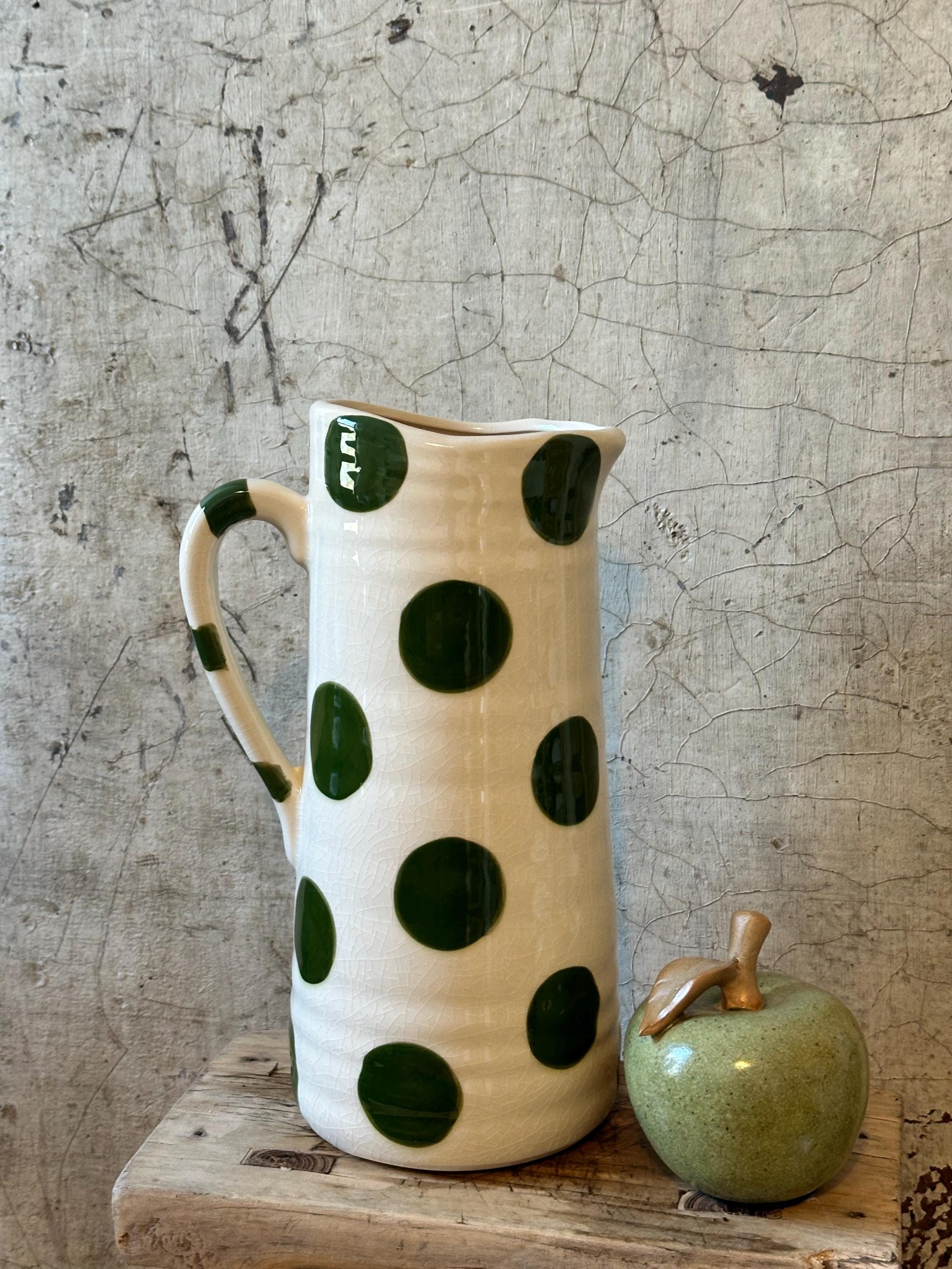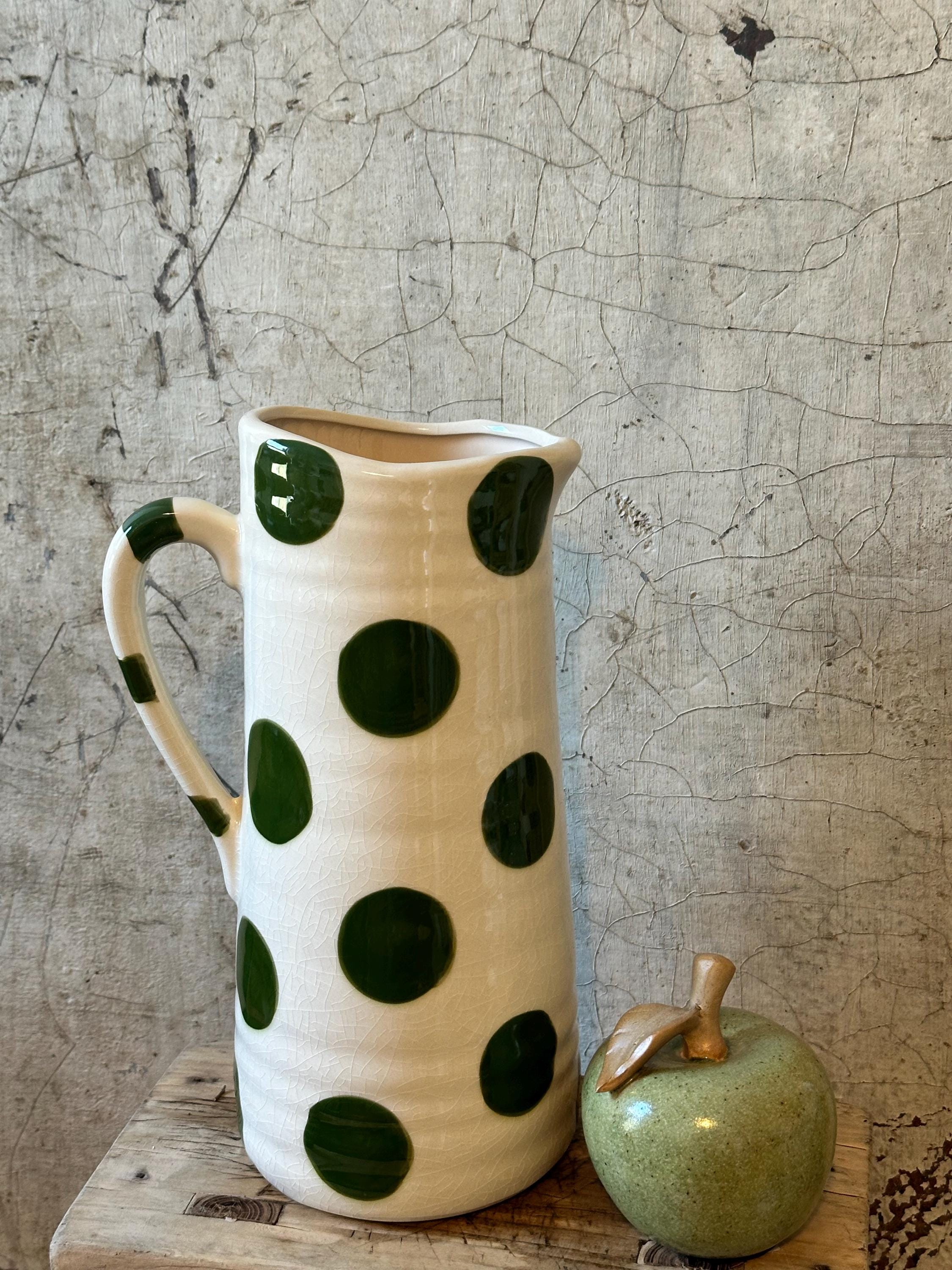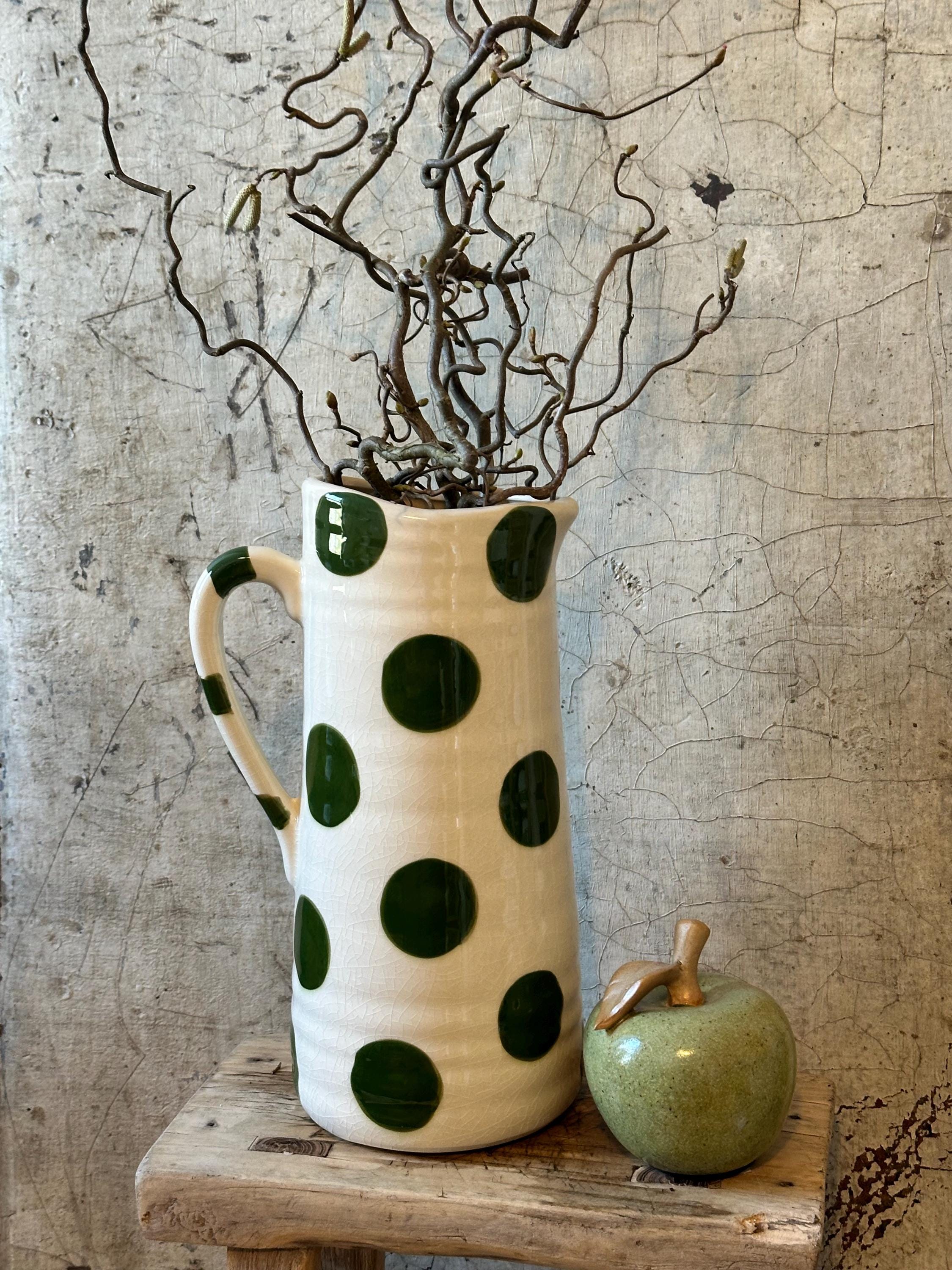 A cheeky ceramic jug - this enchanting jug is modeled after the Swedish country house look - a charmingly cheeky pattern with green dots combined with this beautiful old cracked patina, as if the jug were decades old - it evokes memories of bygone times and is a lovely companion for fresh meadow bouquets, branches or dried grasses - create your own ambience.