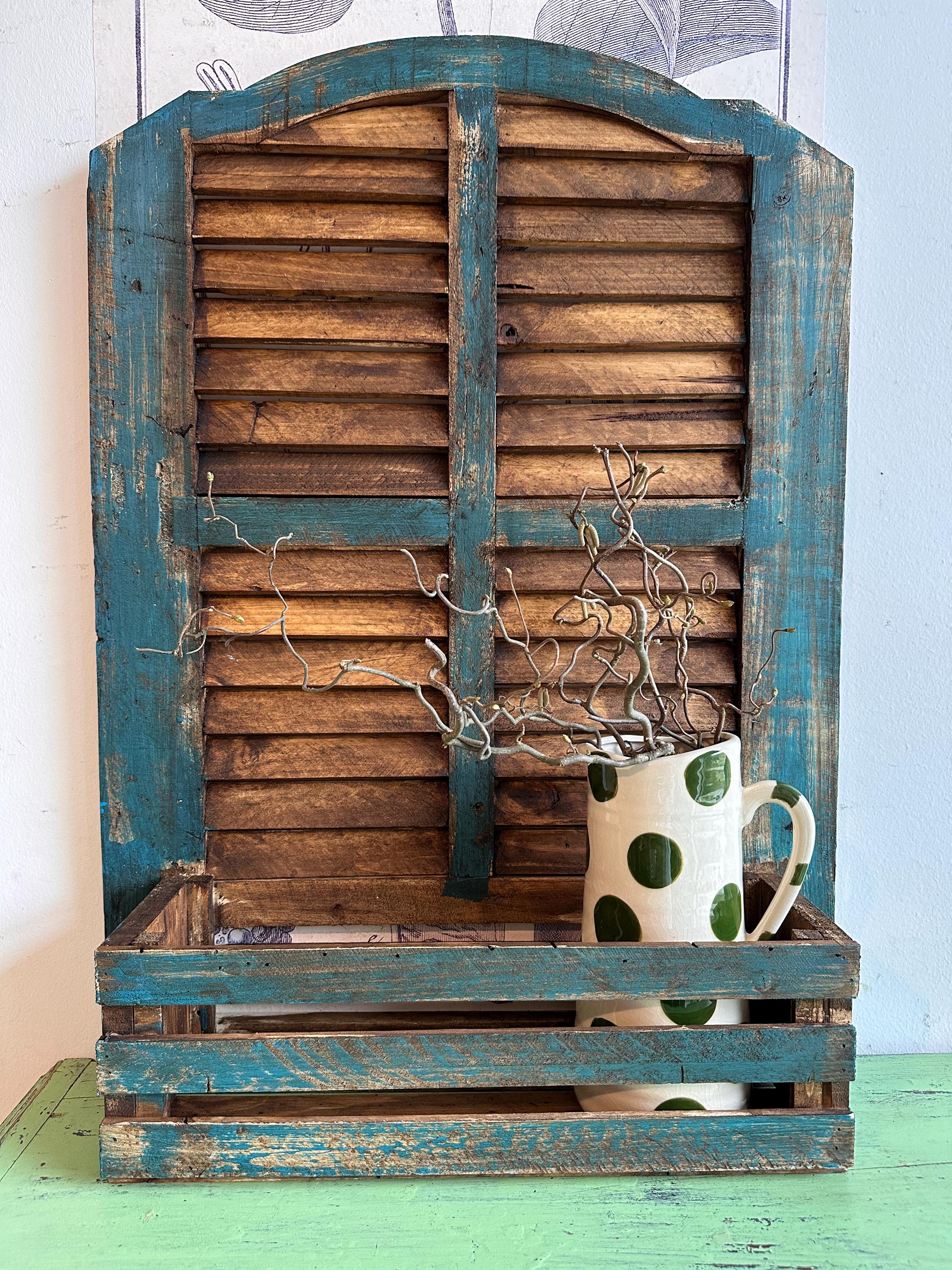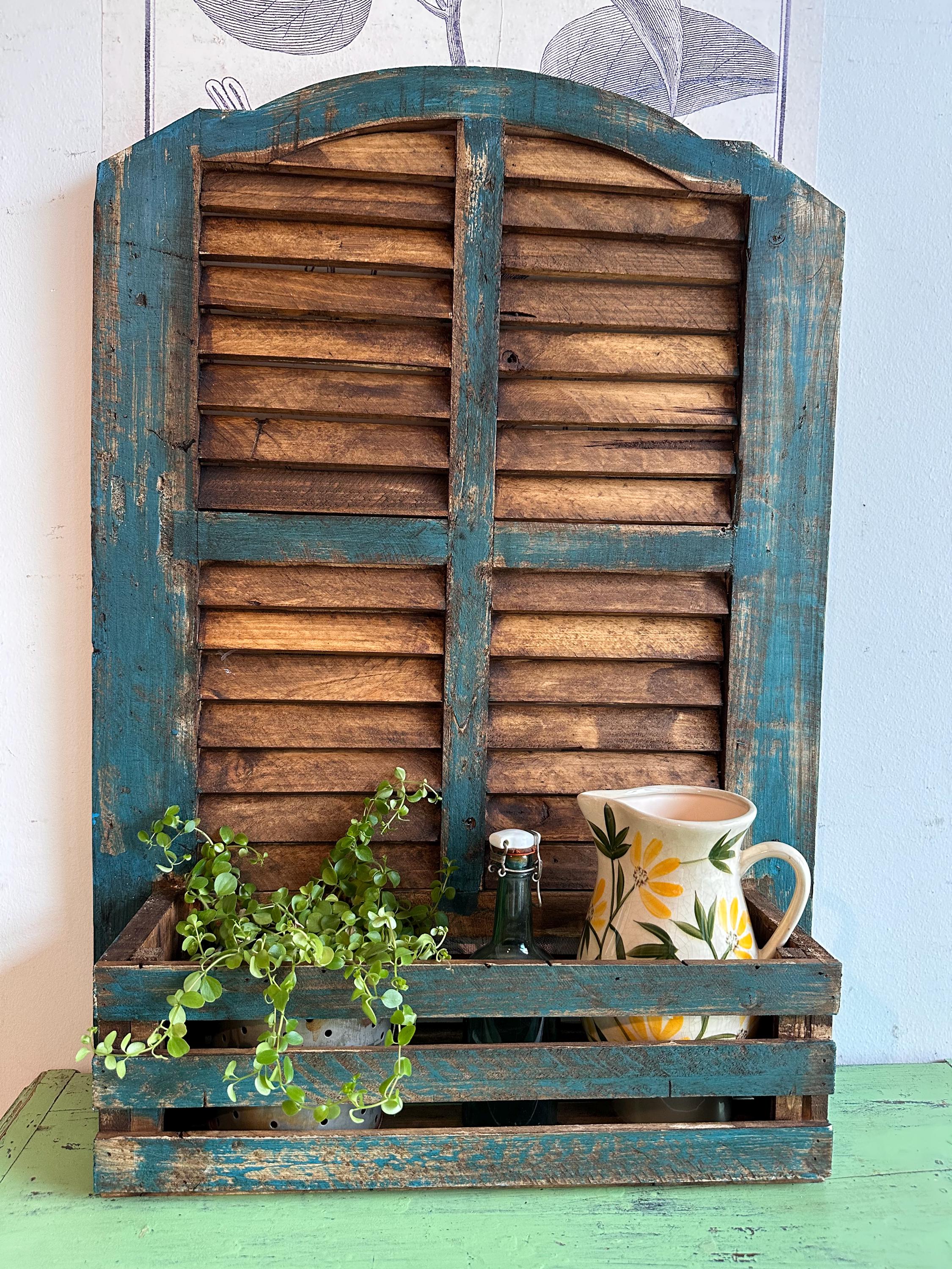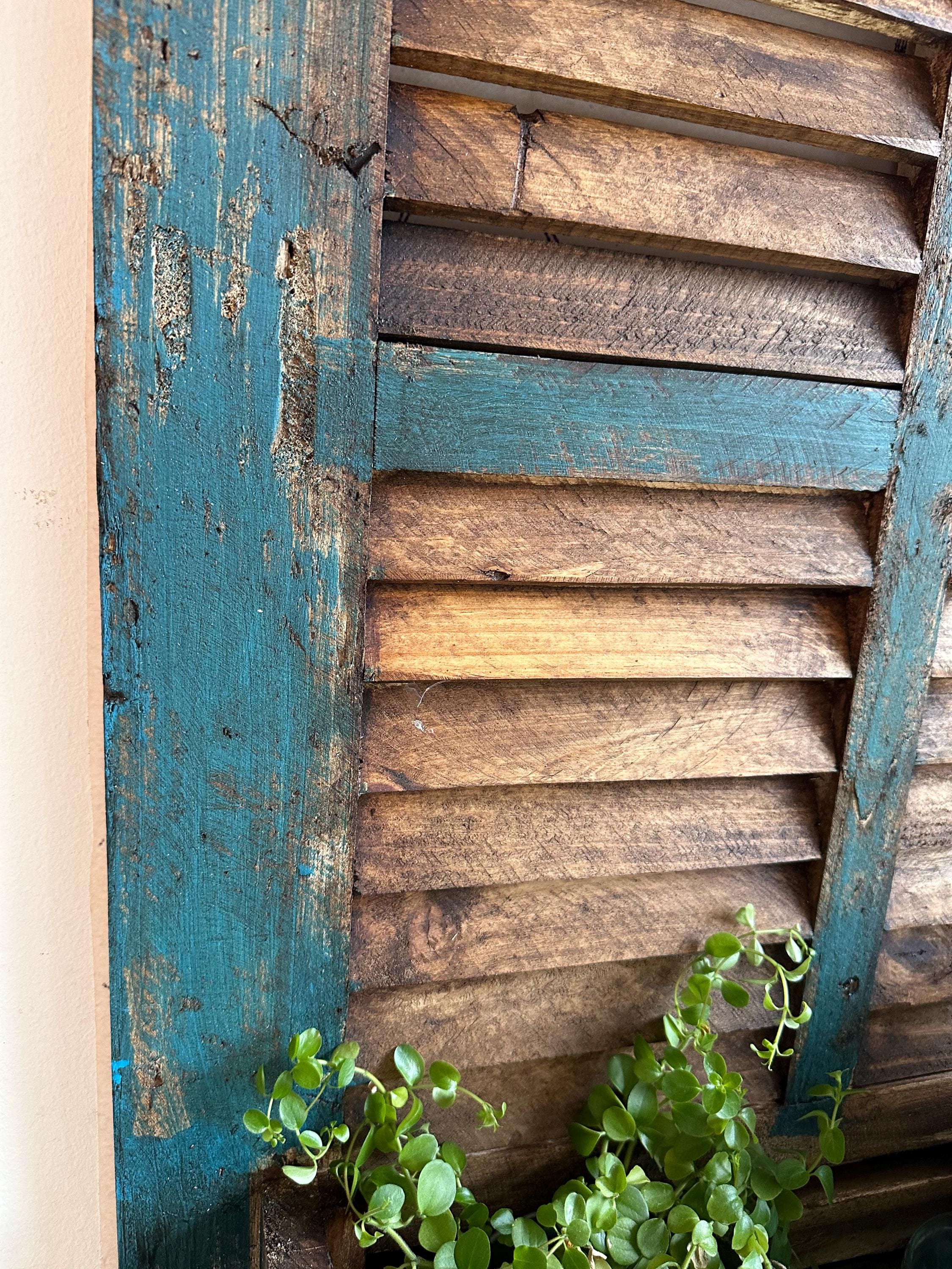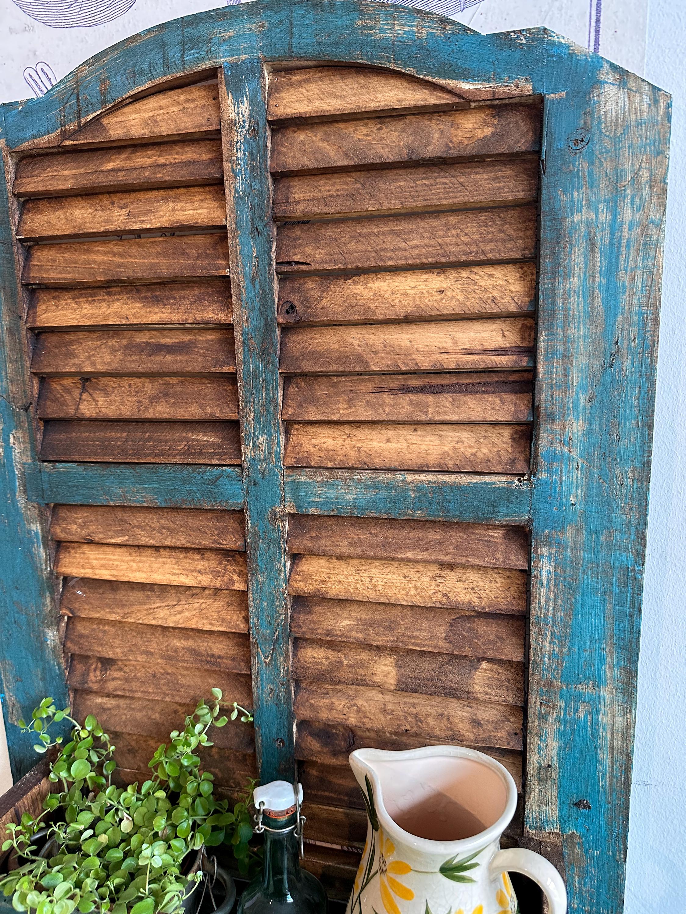 Window shutters – with plenty of patina. Do you love to let your thoughts wander back in time and surround yourself with accessories that bring a touch of bygone eras into our present? How about this window shutter with its little wooden balcony? It looks as if it had graced the drawing room of a country house in the South of France for many years, offering a view of the nearby park. These louvered shutters once adorned houses and served as protection from rain, sun, and wind. Now they've served their purpose, but not entirely. This window decoration can be wonderfully integrated into a unique living space, indoors or outdoors – in the garden as a trellis, built into an old stone wall… your creativity is the only limit! ❤️
