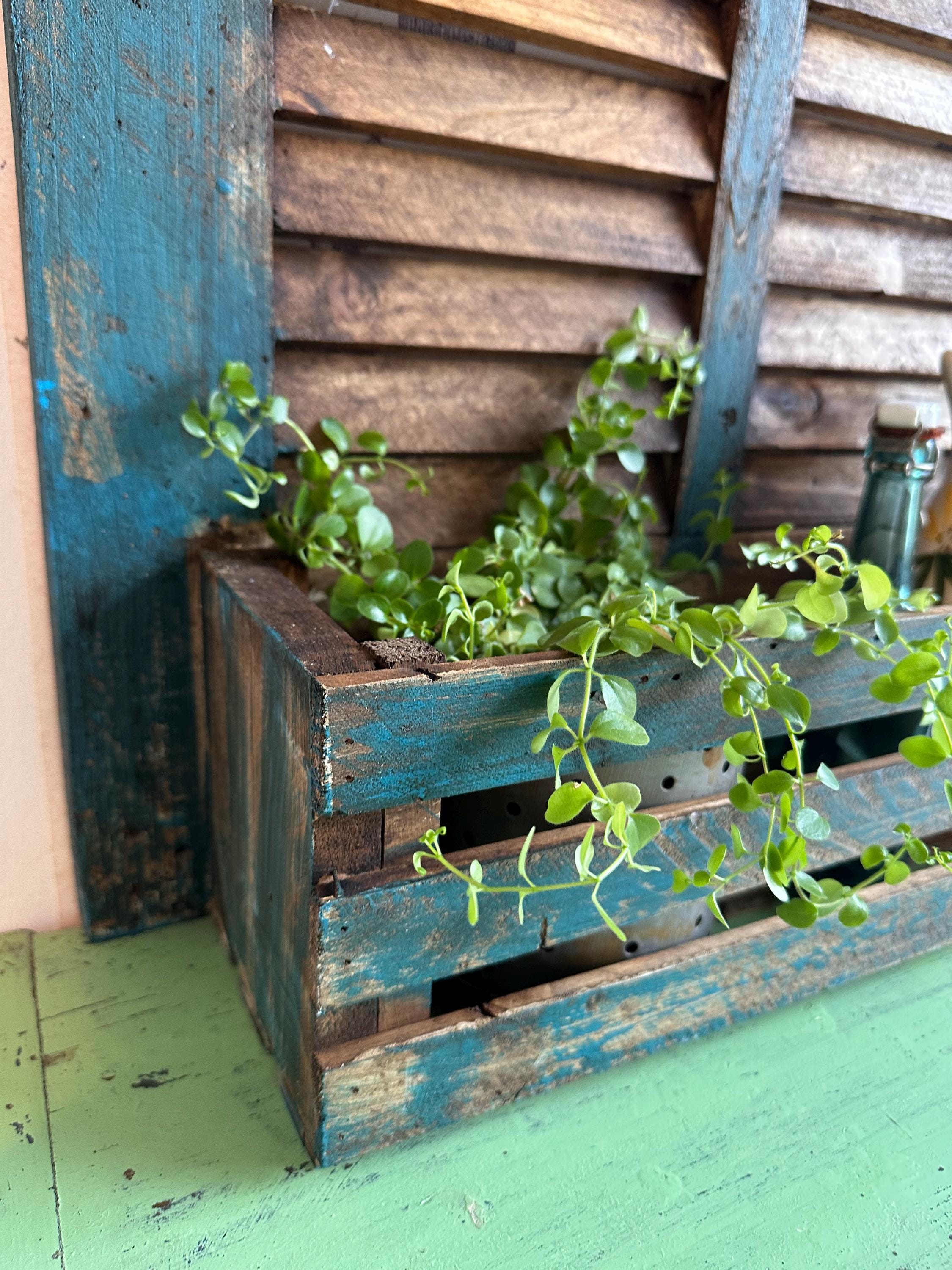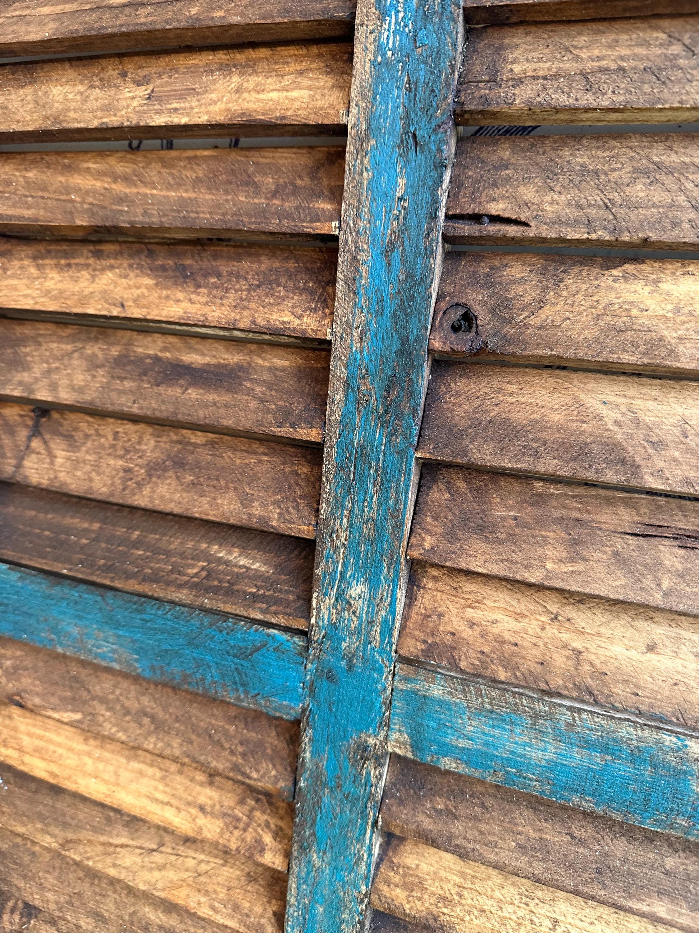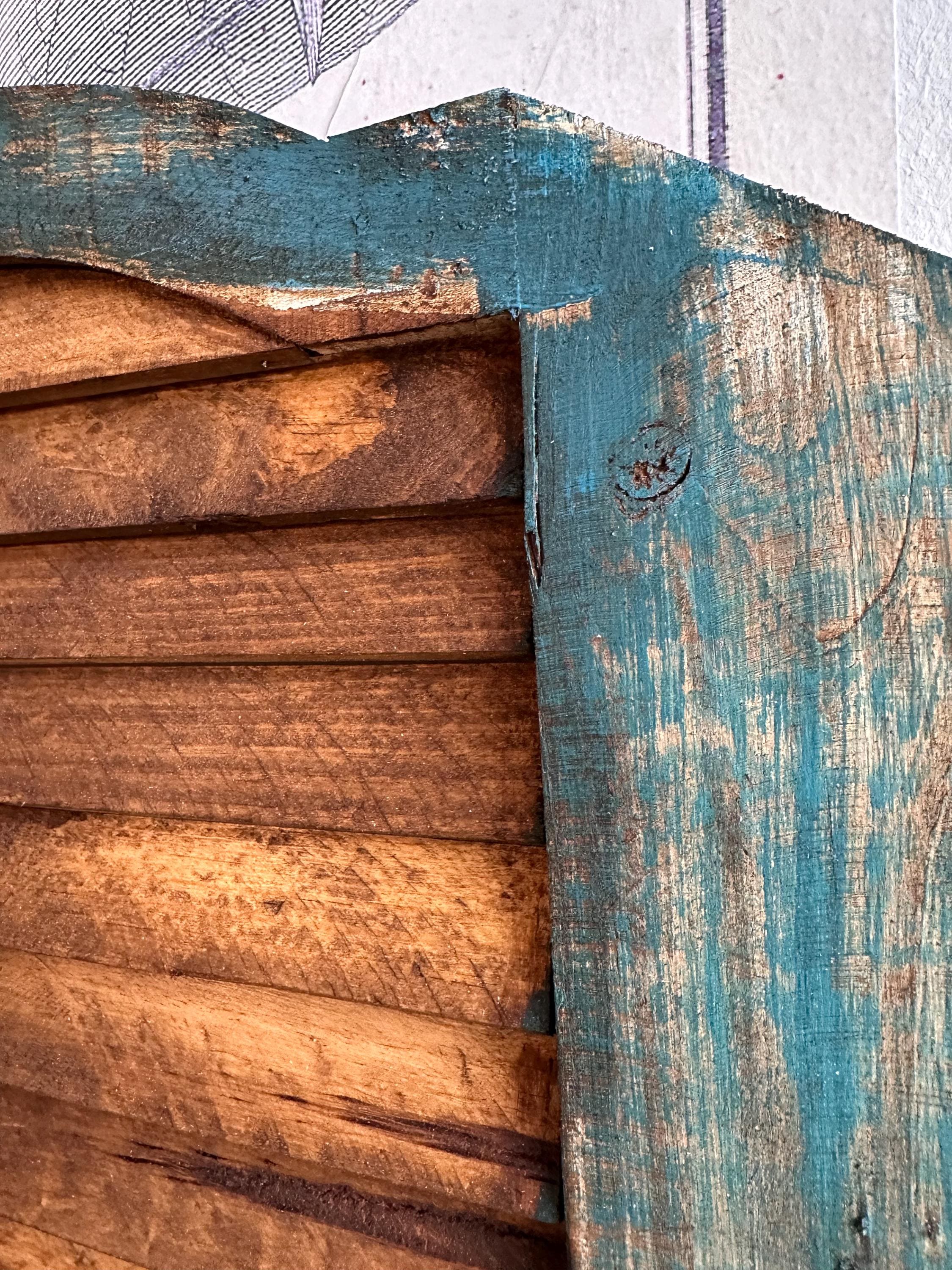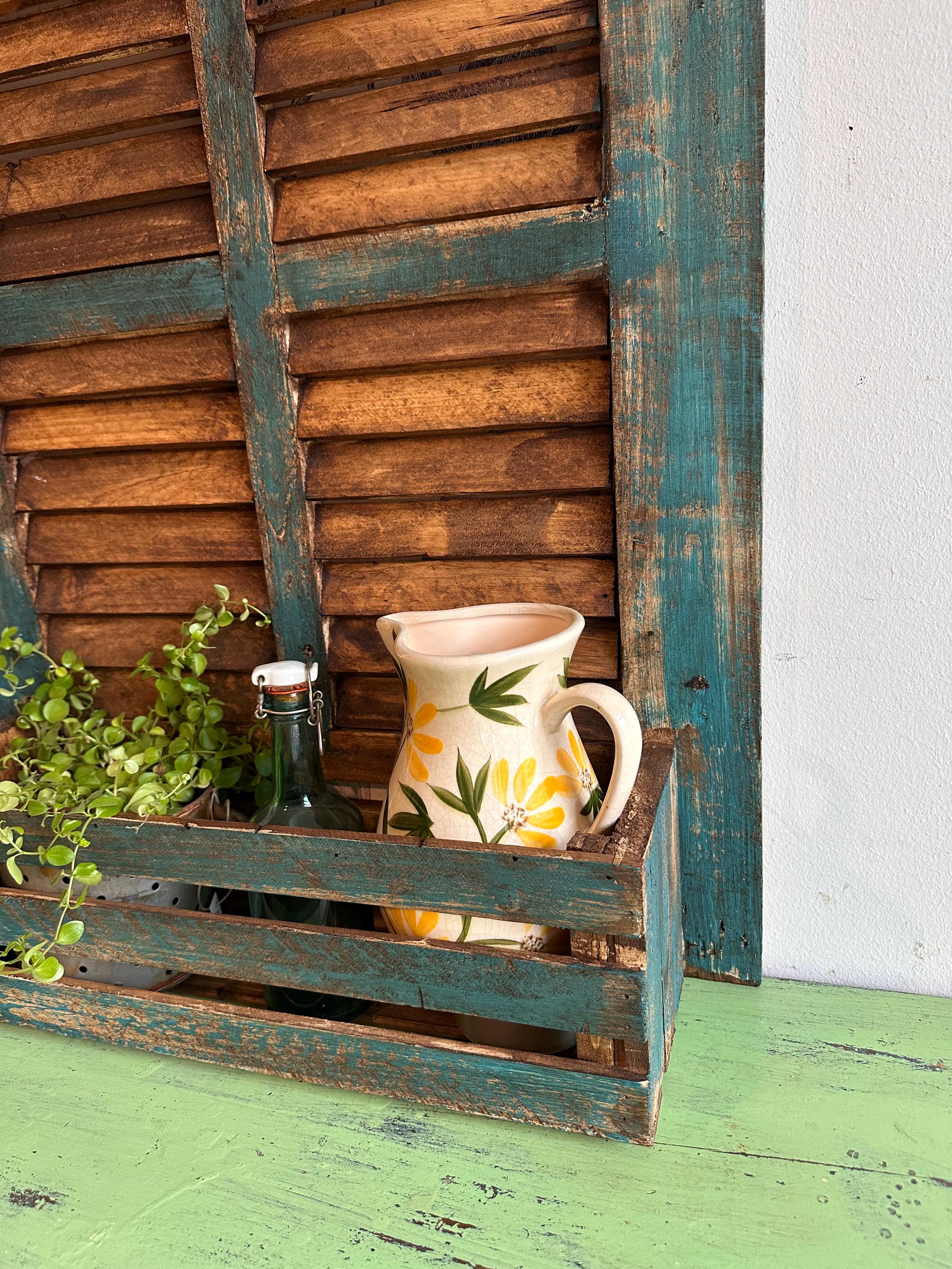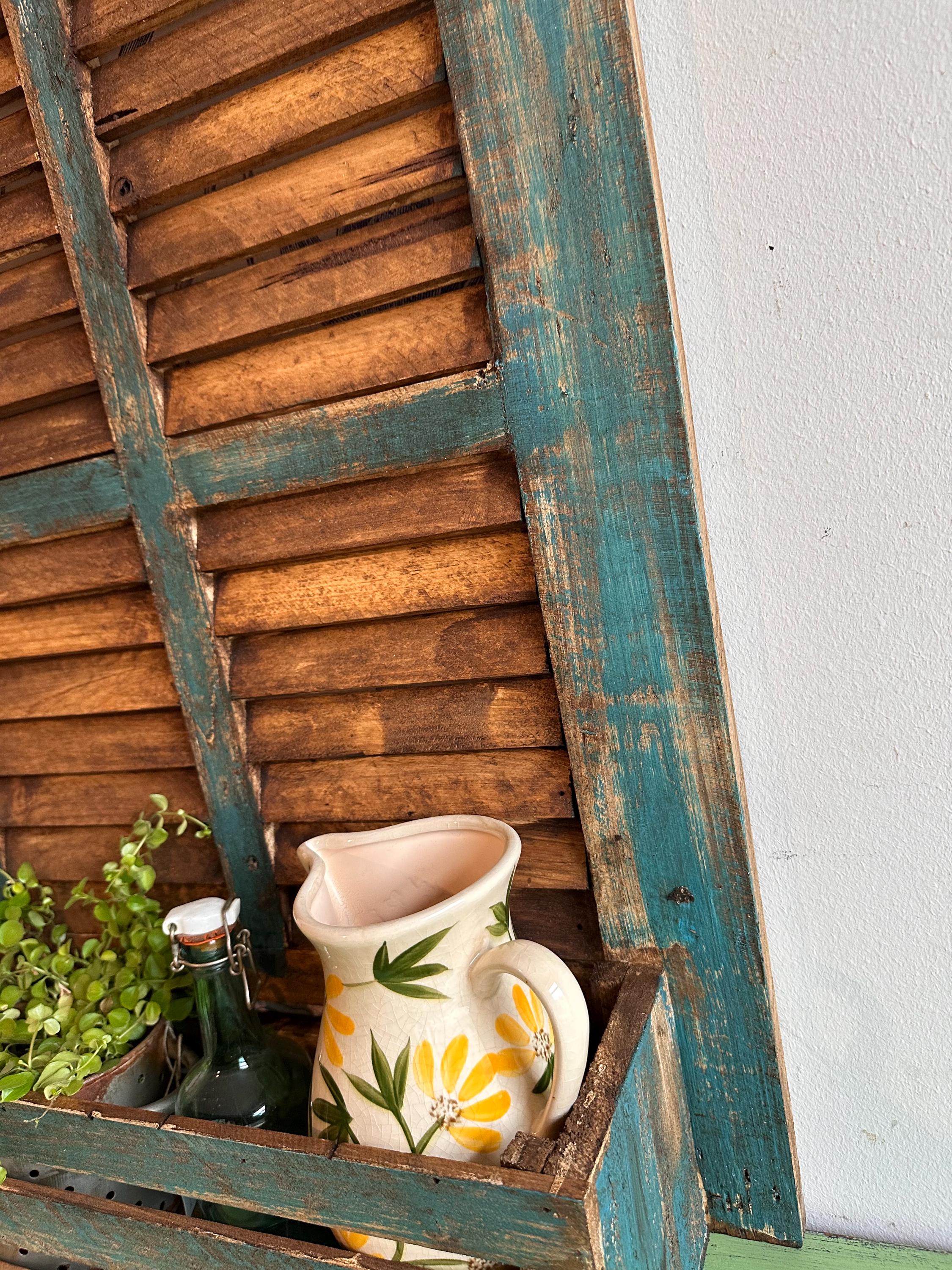 Window shutters – with plenty of patina. Do you love to let your thoughts wander back in time and surround yourself with accessories that bring a touch of bygone eras into our present? How about this window shutter with its little wooden balcony? It looks as if it had graced the drawing room of a country house in the South of France for many years, offering a view of the nearby park. These louvered shutters once adorned houses and served as protection from rain, sun, and wind. Now they've served their purpose, but not entirely. This window decoration can be wonderfully integrated into a unique living space, indoors or outdoors – in the garden as a trellis, built into an old stone wall… your creativity is the only limit! ❤️