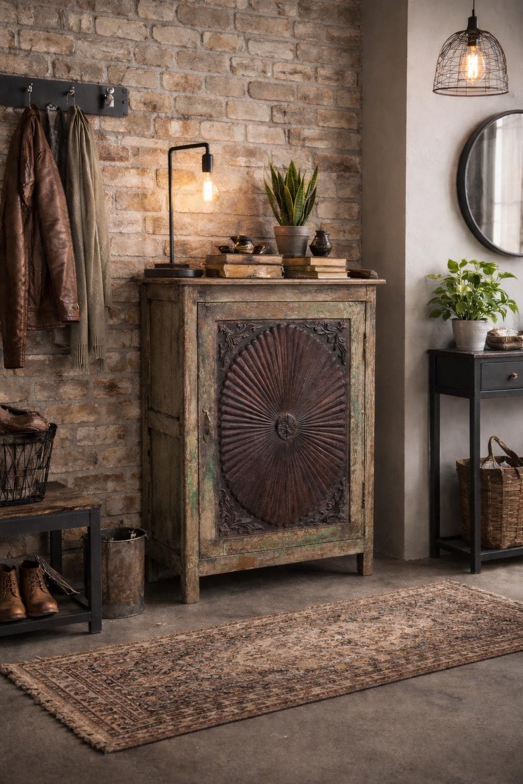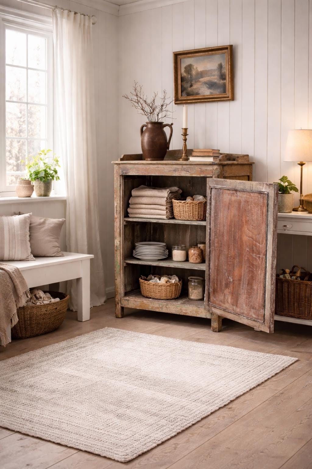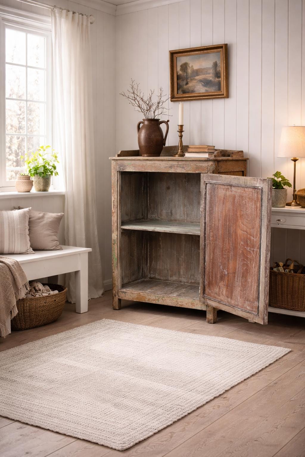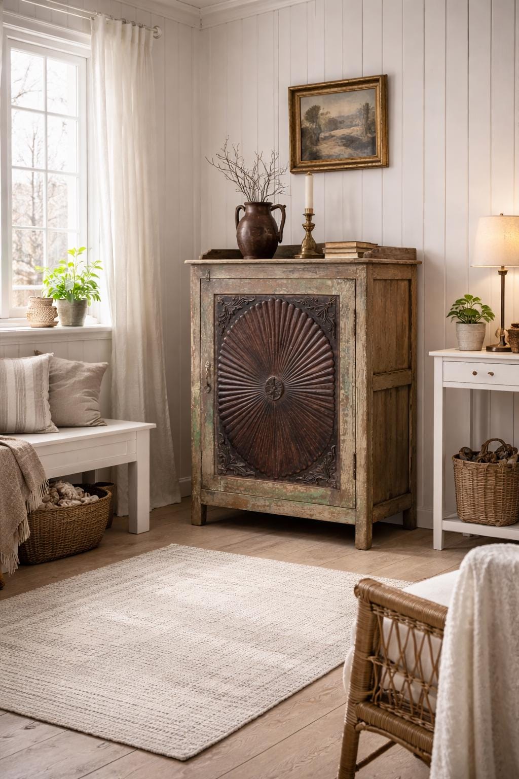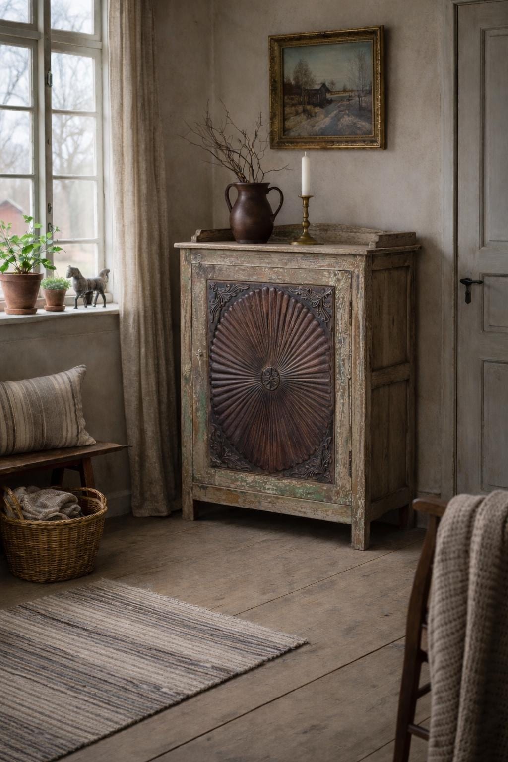 Greta's dreamy wooden cabinet - an incredibly striking patina with carvings and a perfect depth for storing your favorite pieces.