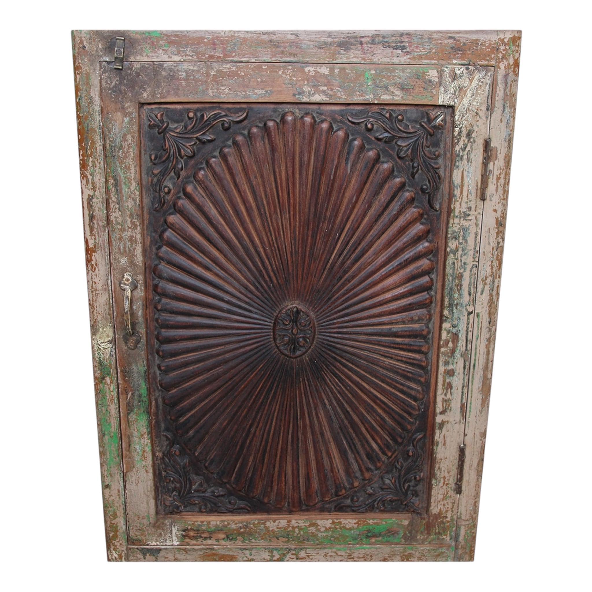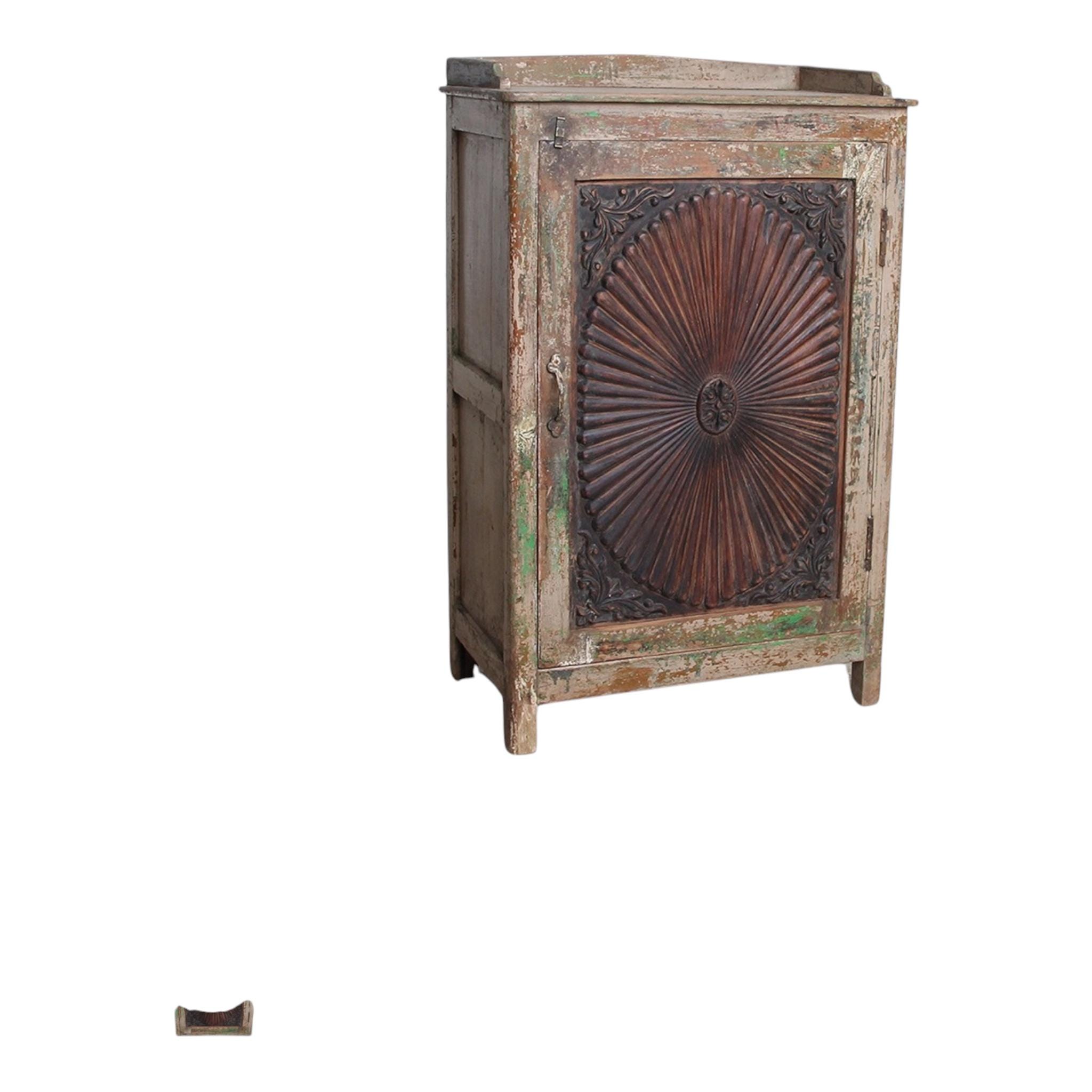 This cabinet embodies the old, rustic feeling of home; not perfect, but unique and dreamy in its sunflower carvings, the old fittings and the witty closure - small details with a big impact. If you are looking for something special, this is exactly the right thing.