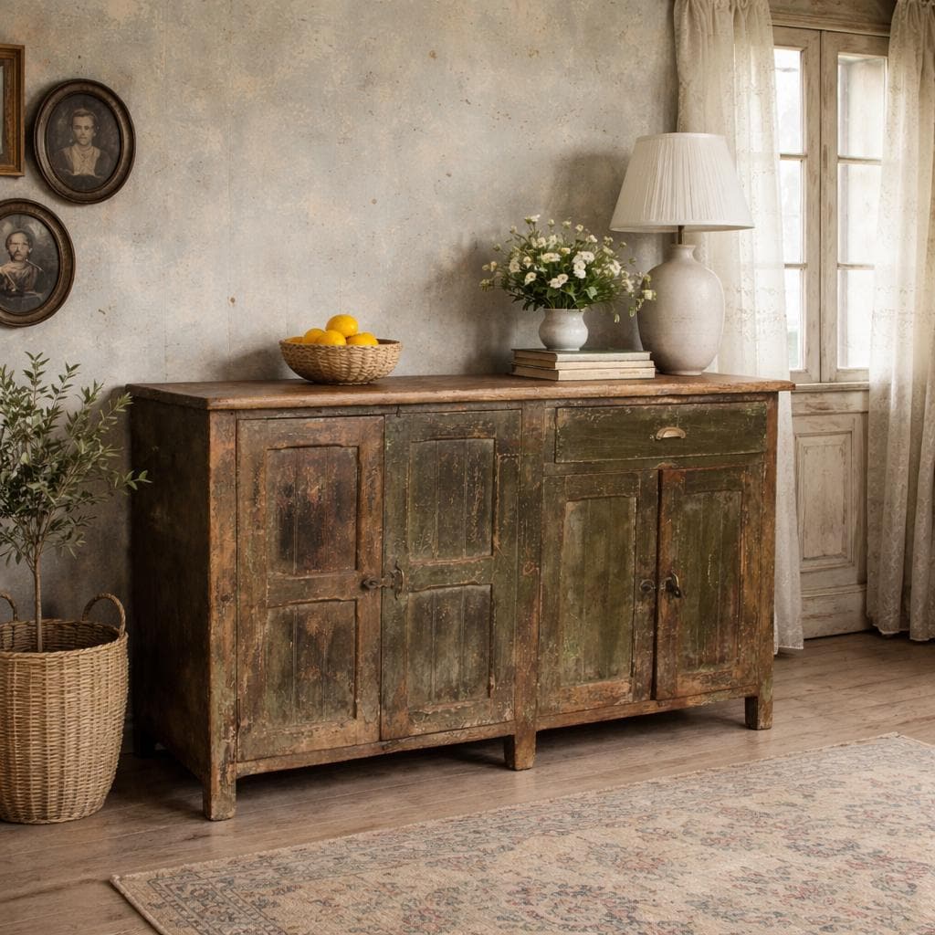This chest of drawers presents the old, rustic feeling of home, not perfect but unique and dreamy in its vintage - soft green-brown, the old fittings and the worn patina - small details with a big impact, if you are looking for something special this is exactly the right thing.