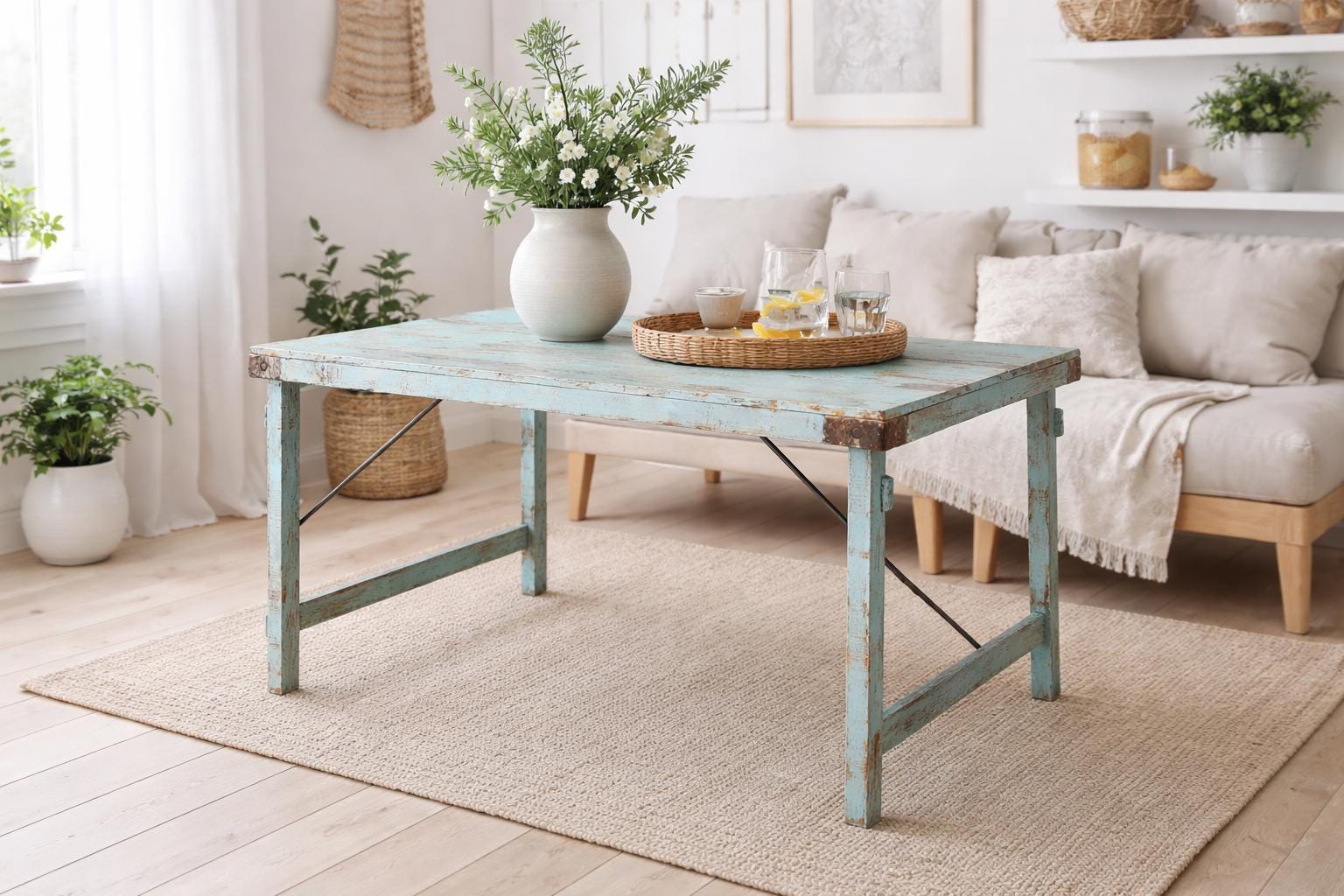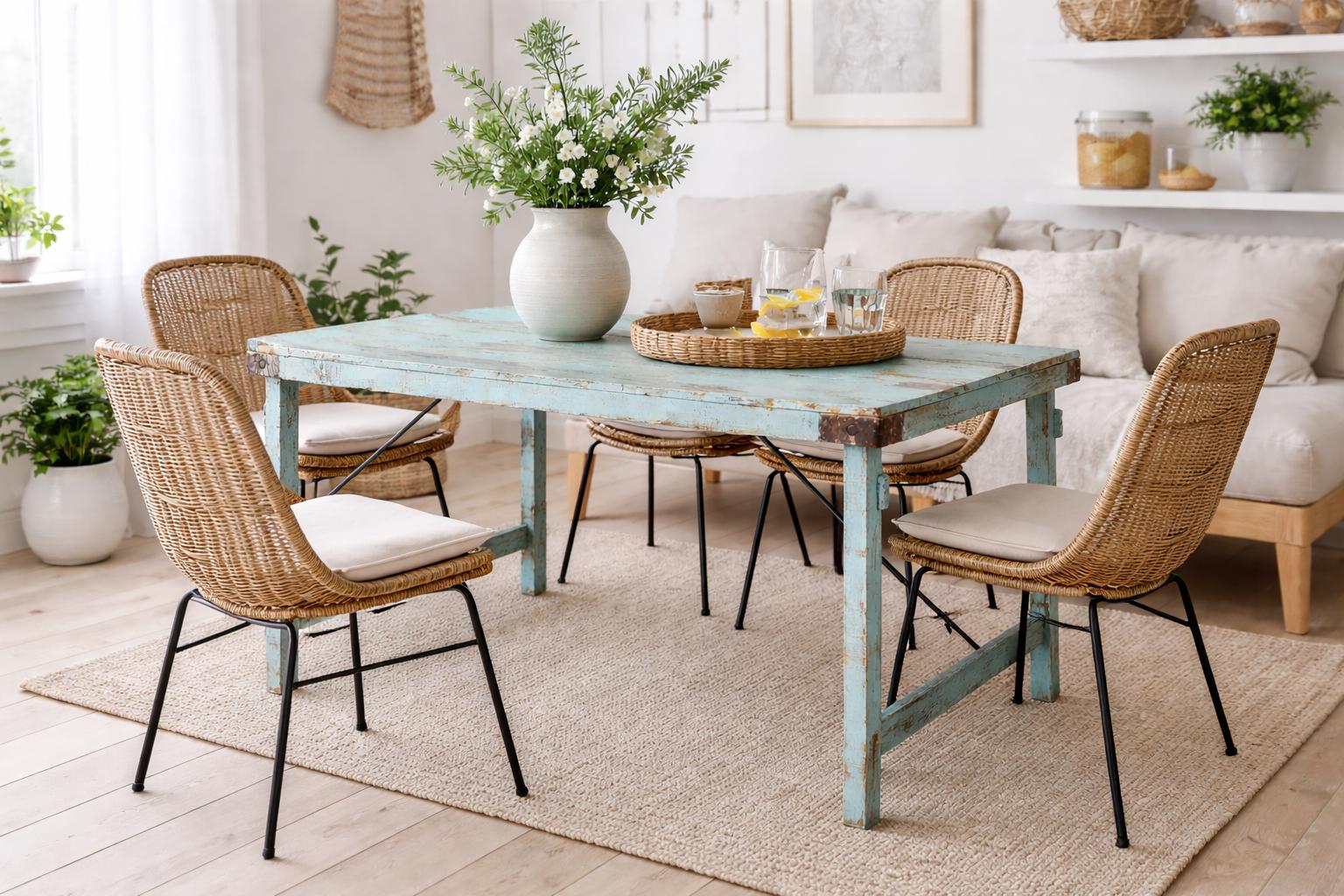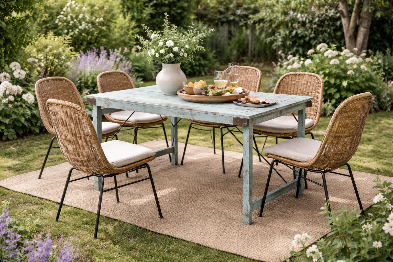 This beautiful table, crafted from recycled wood, captivates with its charming blue finish, giving it a bright and summery feel. It fits perfectly in the garden, alongside our garden benches, or serves as an inviting gathering place in a conservatory or orangery.