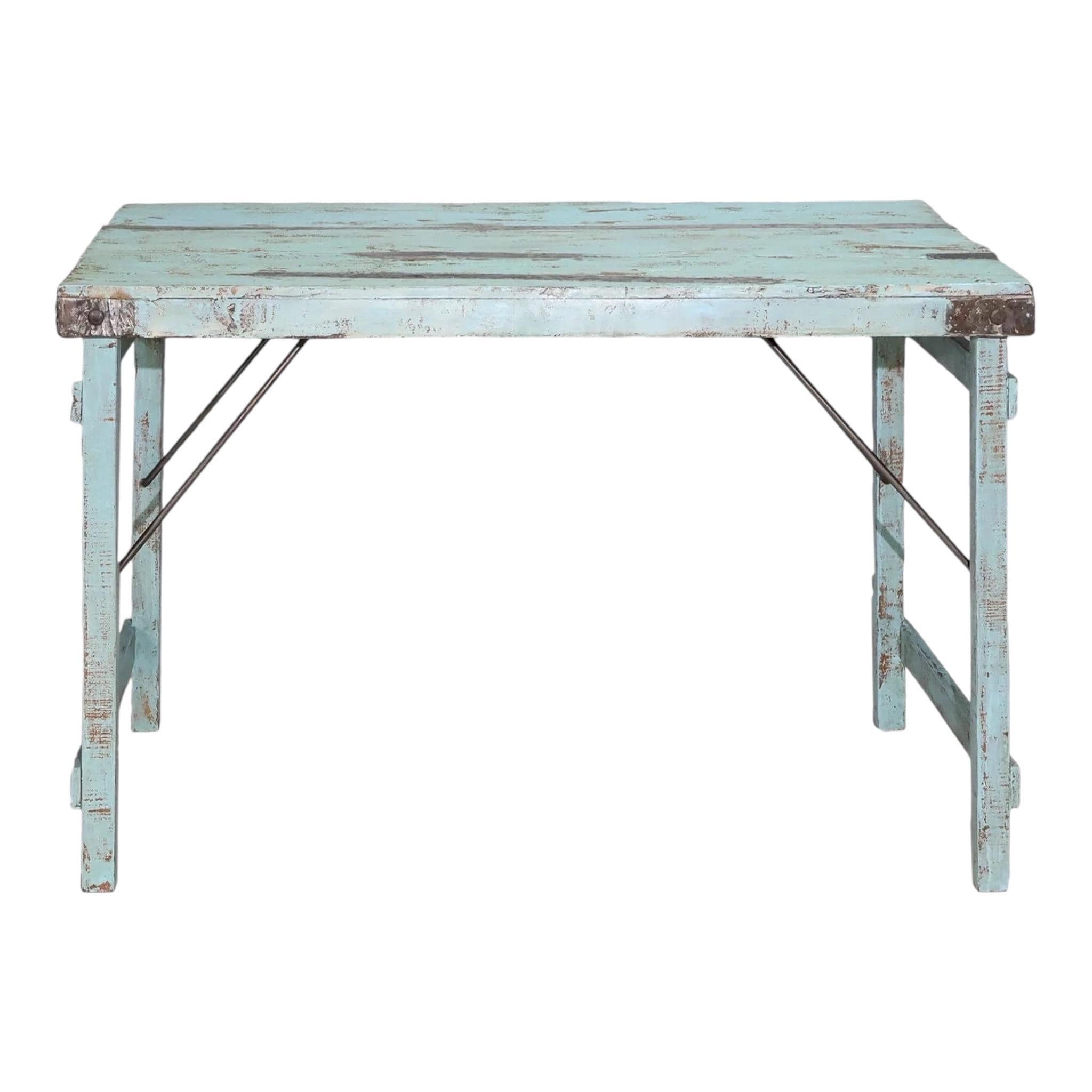 Each table is unique: marks, patina, and small irregularities tell the story of the wood. The table is suitable for outdoor use but should not be permanently exposed to rain and cold, as the wood may crack and the iron may rust over time.